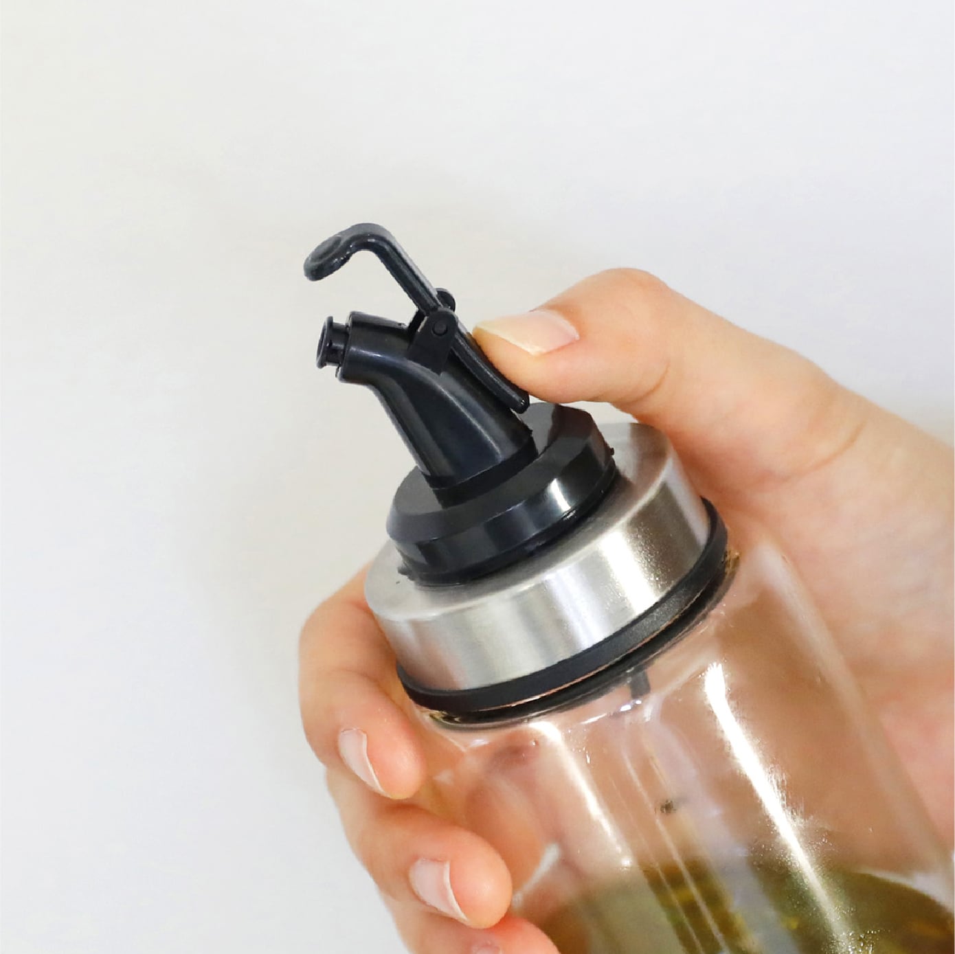 注ぐ量をコントロールしやすい細口の「耐熱ガラスオイル&ドレッシングボトル」です。